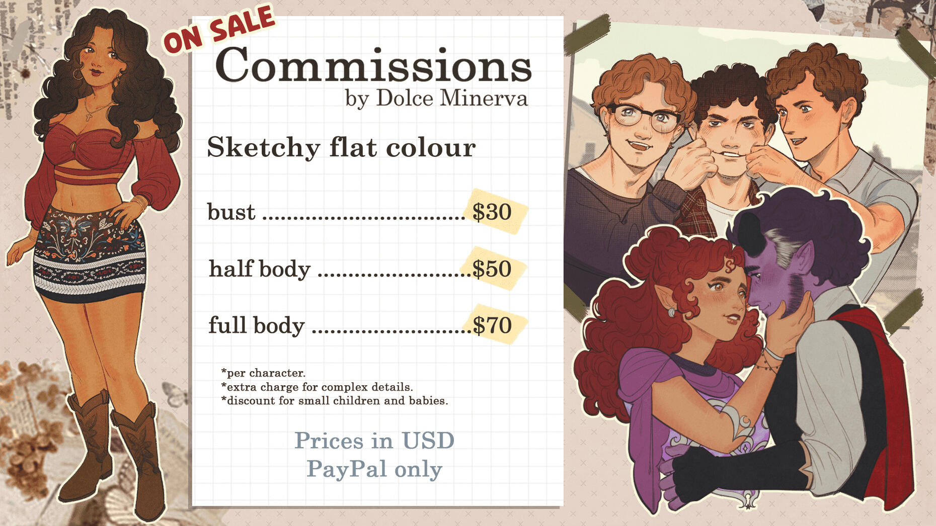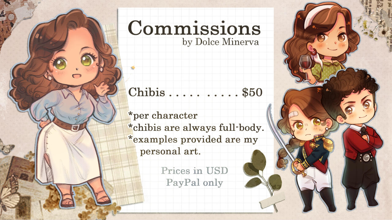 • You cannot rush me or establish a deadline for your commission. The estimate waiting time is between two weeks and two months.→My work is very slow and irregular, but I always finish what I owe.•I reserve the right to reject a commission request without further explanation.•I reserve the right to continue working and posting my personal art in-between commission work. I always try to find a balance between commission work and personal art to be respectful of my customers.•I reserve the right to post all commissioned work on my social media for self-promotional purposes. If you want your commission to be private, you can ask but there might be a small fee.•I approach all customers in good faith and respect. I expect you to be respectful to me as well.•When I am working with multiple orders at the same time, you can keep up with updates of my progress on my Twitter @DolceMinverva97. I make all commission-related announcements in this account.