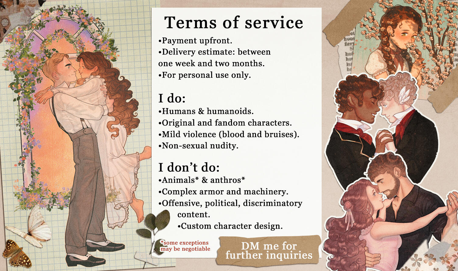 •This is a suggestion, but please try to avoid leaving the pose and composition "to my imagination". The more visual references and clear ideas you provide, the more efficient and fast my work will be. You can provide reference pictures and even doodles to illustrate your idea. I appreciate as much visual aid as possible!